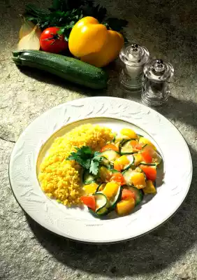 Wash the millet and let it swell for 30 minutes in 400 ml vegetable stock at medium heat. Peel and finely chop the onions. Wash and clean peppers, zucchini and tomatoes. Dice peppers and tomatoes.