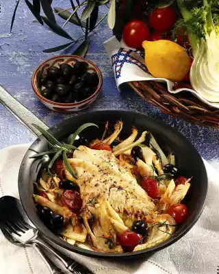 Just before the end of the frying time, add the tomatoes and olives and mix in. Season with salt and pepper. Sprinkle fish with coloured pepper and serve garnished with rosemary.
