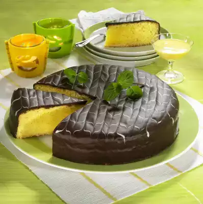 Stir in clarified butter. Chop and melt the white chocolate coating. Cover the cake with the dark chocolate coating. Pour the white couverture into a freezer bag, cut off a small corner and draw fine horizontal stripes over the dark couverture. Using a small wooden stick, draw vertical lines alternately from above and below at even intervals. Let the couverture dry for about 1 hour. Decorate with mint