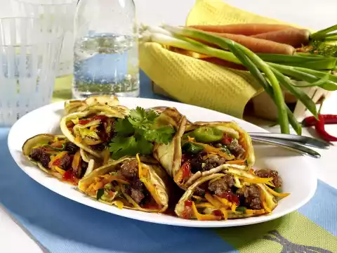 Fold in chilli sauce. Cover the vegetable mince pan and set aside. Spread a small coated pan (approx. 18 cm Ø) with oil and heat it up. Bake 8 pancakes from the dough one after the other, brushing the pan with oil over and over again.