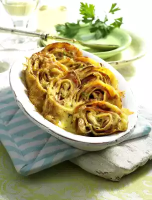 Cut the rolls into approx. 3 pieces each, place them in a greased casserole dish or ovenproof deep dish. Stir the rest of the cheese sauce with 5-6 tbsp. milk until thin and pour over. Sprinkle with the rest of the cheese. Bake in a preheated oven (electric cooker: 225 °C/circulating air: 200 °C/gas: level 4) for 15-20 minutes