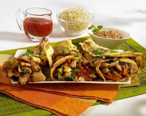 Bake 4 pancakes one after the other. Arrange the vegetables on the pancakes, form into bags and sprinkle with the remaining coriander.
