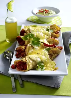 Bake in the preheated oven (electric cooker: 175 °C/ convection oven: 150 °C/ gas: level 2) for approx. 25 minutes. In the meantime, cut the avocado in half for the guacamole, remove the core. Remove the flesh from the skin and dice coarsely.