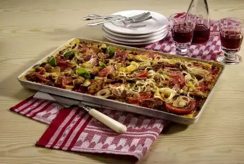 Mix the gipsy sauce with tomato paste and spread it on the pancake. Cover one half with tomatoes, onions and tuna and sprinkle with thyme. Quarter the ham slices. Cover the other half with mushrooms and ham.