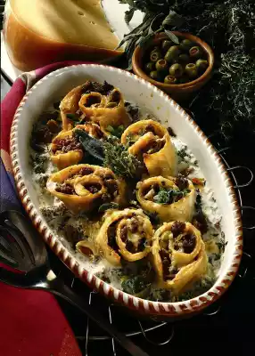 Do the same with the remaining oil and dough. Pour the mince mixture onto the pancakes, roll up the pancakes and cut each roll into 4 diagonal slices. Mix the rest of the cream cheese preparation, milk and egg yolk.