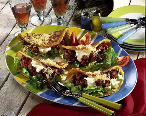 Fill the pancakes with salad, minced meat and crème fraîche and fold over. Sprinkle with cheese. Garnish with parsley and tomatoes if desired