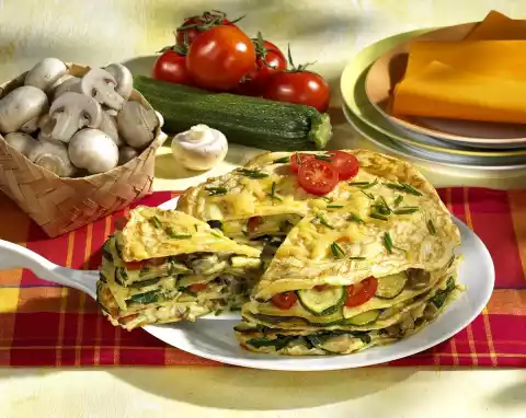 Fry 5 pancakes from the dough. Layer the pancakes, vegetables and sauce to form a tower. Sprinkle the pancakes with 25 g cheese and bake in a preheated oven (electric cooker: 200 °C/ convection oven: not suitable/ gas: level 3) for approx. 10 minutes.
