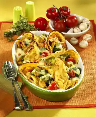Add broccoli and bring to the boil briefly. Finally fold in tomatoes. Fold the pancakes into quarters and fill with the vegetable ragout. Place the filled pancakes in a greased casserole dish. Grate cheese and sprinkle over the pancakes. Bake in a preheated oven (electric cooker: 200 °C/ convection oven: 175 °C/ gas: level 3) for approx. 10 minutes