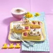 Add the raisins, walnuts, candied orange peel and cinnamon, bring to the boil and boil while stirring for about 2 minutes until you have a spreadable mixture. Let it cool down a little, then add the drained rum. Stir mineral water into the pancake batter. Heat some clarified butter in a pan. Add a small ladle of batter and bake while turning until golden brown. Remove from the pan immediately and bake 11 more thin pancakes. Spread some nut filling on one half of the pancakes, fold over the other half and roll up. Keep filled pancakes warm. For the chocolate sauce, chop the chocolate roughly and melt it on a hot water bath. Whip 150 g whipped cream until stiff and put in a cool place. Bring 250 ml milk, 30 g sugar and vanillin sugar to the boil. Stir egg yolk and 80 sugar until creamy. Add cocoa, 15 g flour and 50 ml cold milk and stir well. Add liquid chocolate and stir in.