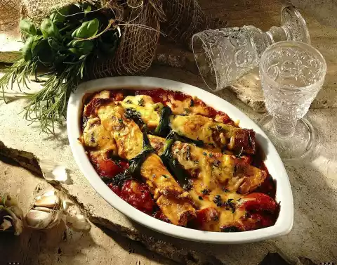 Put the tomato sauce in a greased, ovenproof dish. Roll up the pancakes and tie them together with the leek and onion greens put aside and place them on the sauce. Sprinkle with cheese and bake in the preheated oven (electric cooker: 200 °C/ gas: level 3) for about 20 minutes.