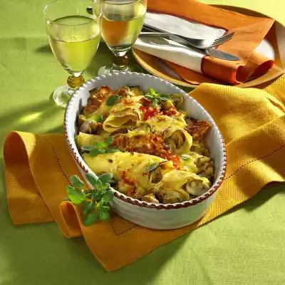 Put the filled pancakes in an ovenproof dish. Spread the rest of the mushroom mixture around the pancakes. Put bacon slices between them. Sprinkle the rest of the cheese on top. Bake in the preheated oven (electric cooker: 200 °C/ convection oven: 175 °C/ gas: level 3) for 10-15 minutes. Sprinkle with tomato cubes and garnish with marjoram