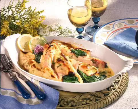 Whisk the egg yolks and dill and stir into the sauce. Do not let it boil any more! Heat 1 teaspoon of oil in a pan and fry 4 thin pancakes one after the other. Clean, wash and drain the spinach. Cover each pancake with 2 spinach leaves and 2 salmon slices and roll up. Layer the pancakes in an ovenproof dish. Spread the sauce on top and bake in the preheated oven (electric cooker: 225 ° C/ gas: level 4) for about 10 minutes. Garnish with the remaining dill and lemon slices