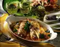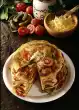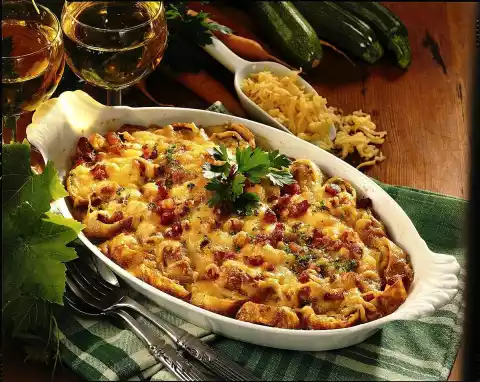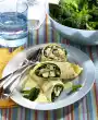 Heat clarified butter in portions in a pan, fill in one ladle of batter each, add strips of vegetables, turn and bake 8 pancakes one after the other until golden brown. Let the pancakes cool down a bit, roll them up and cut them open. Leave out the bacon in the pan, take it out and put it aside. Deglaze the drippings with cream, bring to the boil and season with salt, pepper and nutmeg. Put pancake rolls in an ovenproof dish, pour cream over them, sprinkle with cheese and bacon and bake in the preheated oven (electric cooker: 175°C/ gas: level 2) for approx. 25 minutes. Serve garnished with parsley as desired