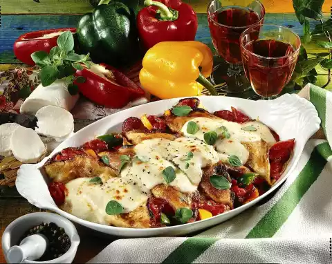 Wash the oregano, dab dry and pluck the leaves from the stalks. Heat 1 tablespoon of oil in a frying pan, fry the onions until translucent, add the garlic, peppers, 3/4 of the oregano and cabanossi and fry for about 2 minutes, turning them over. Add tomato paste, ketchup and tomato pulp, simmer for about 5 minutes and season with salt, pepper and paprika. Drain mozzarella on a sieve and cut into slices. Heat the rest of the oil in a frying pan and make four pancakes from the dough one after the other until golden brown. Fill the pancakes with the tomato sauce, place them in an ovenproof dish, cover with the mozzarella and bake in a preheated oven (electric cooker: 200 °C/ gas: level 3) for approx. 15 minutes. Sprinkle with coloured pepper and serve garnished with the remaining oregano leaves