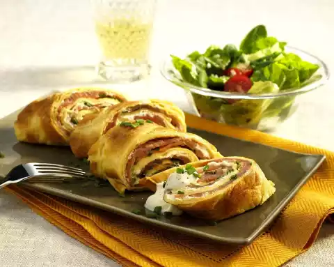 Spread with horseradish and 150 g crème fraîche. Sprinkle with chives. Spread salmon on top and roll up the pancakes tightly from the long side, cut into thick slices and arrange on a plate. Put a dash of crème fraiche on top. Serve the rest of the crème fraîche extra. Serve with a green salad with tomatoes