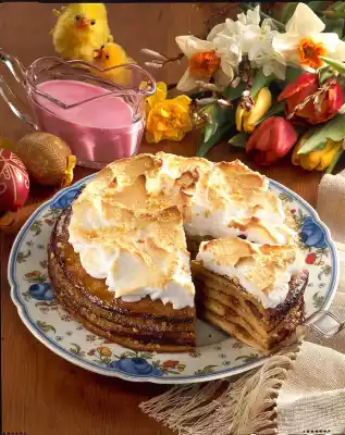 In the meantime beat the remaining egg white until stiff. Stir in remaining icing sugar by the spoonful. Spread the pancakes with beaten egg white and brown again in the oven. Serve hot, sprinkled with remaining nuts.