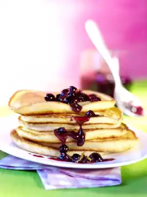 Stir the dough. Bake small pancakes in little hot clarified butter. Arrange the pancakes with the orange-blueberry sauce.