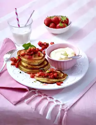 Arrange pancakes on plates with some strawberry mint tartare. Sprinkle with pistachios and remaining lemon peel and garnish with mint. Add the rest of the strawberry mint tartare and advocaat cream.