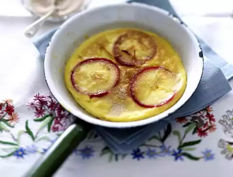 Heat clarified butter in portions in a pan (21 cm Ø at the top and 16 cm Ø at the bottom). Add approx. 2 ladles of dough, place 3 apple rings on top and bake at medium heat for approx. 2 minutes on each side.