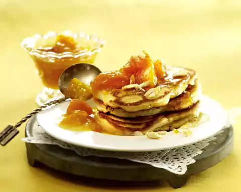 Makes about 12 pancakes. Arrange the pancakes with apricot compote. Drizzle with maple syrup and sprinkle almonds.