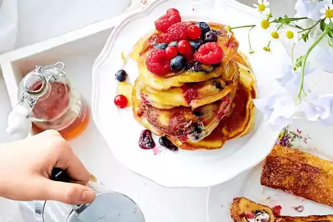 Remove, stack on top of each other and keep warm in the oven (50 °C) until the dough is used up. Serve with the rest of berries and maple syrup.