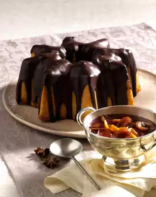 Beat the fat, 375 g sugar, vanillin sugar and salt with the whisk of the hand mixer until foamy. Stir in the eggs one after the other. Add egg liqueur and continue to stir until the sugar is completely dissolved. Add flour, baking powder and almonds and stir in. Pour the dough into a greased star-shaped cake tin (2.5 litres capacity) sprinkled with flour, smooth it down. Bake in the preheated oven (electric cooker: 175 °C/ convection oven: 150 °C/ gas: level 2) for 55-65 minutes. Take the cake out of the oven, place on a grid and let it cool down for 25-30 minutes. Then turn out of the tin and let it cool down. Coarsely chop the chocolate for the icing. Warm the cream, add the chocolate and coconut fat, and melt in it over a low heat while stirring. Allow to cool for approx. 30 minutes at room temperature while stirring several times. Then run over the fallen cake. Chill for 2-3 hours. In the meantime, pour the plums into a sieve, drain well, collecting the juice. Stir starch and 25 g sugar until smooth. Boil up the plum juice, star anise, cinnamon sticks and orange peel. Carefully remove the spices from the juice and set aside. Add starch while stirring, bring to the boil again and simmer for about 1 minute. Remove from the heat, carefully mix in plums, add spices again. Serve cake and plums together. Serve with whipped cream sprinkled with cinnamon