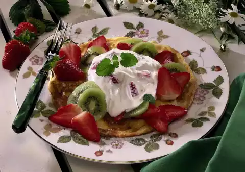 Peel and slice the kiwi. Arrange pancakes, curd cheese and fruits on a plate. Garnish with lemon balm and serve dusted with caster sugar.