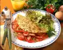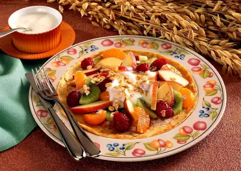 Add lemon juice and some sweetener. Roast the oat flakes in a frying pan Bake pancakes in hot oil. Season yoghurt with cinnamon and sweetener Cover pancakes with fruit. Add yoghurt and sprinkle with roasted oat flakes.