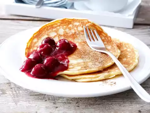 Mix cinnamon and 2 tablespoons of sugar. Heat the cherries again. Arrange pancakes, add cherries and cinnamon sugar.