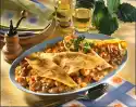 Wash, clean and halve the tomatoes. Heat 2 tablespoons of oil in portions in a pan (approx. 20 cm Ø). Bake 4 pancakes one after the other, keep warm. Heat 1 tablespoon of oil and fry the minced meat. Add onion, zucchini and mushrooms and fry for about 1 minute. Add 500 ml water and crème fraîche, bring to the boil. Stir in stock and simmer for 4-5 minutes at low heat. Stir the sauce thickener into the minced meat sauce, simmer for 1 minute. Add tomatoes to the minced meat sauce and cook for 1-2 minutes. Season to taste with salt and pepper.