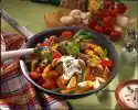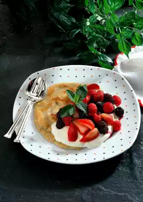 Clean, wash and sort the berries. Mix with quark, crème fraîche and sugar and arrange on the pancake.