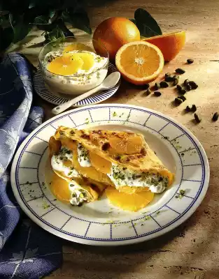Bake a thin pancake from the dough in a coated pan (approx. 20 cm Ø) until golden brown. Cover with curd cheese and orange slices and fold over into a bag. Sprinkle pistachios over it