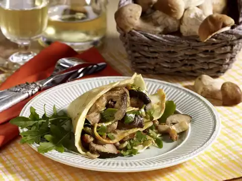 Heat 2 tablespoons of oil in portions in a frying pan (20 cm Ø). Bake 4 pancakes one after the other. Fill the pancakes with the mushroom pan and arrange on plates. Garnish with remaining rocket.