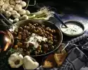 Fry the mushrooms for about 10 minutes, turning them over. After 4 minutes add garlic, onion and nuts. Stir in crème fraîche 2 minutes before the end of cooking time and season with salt and pepper. Fold in the rocket.