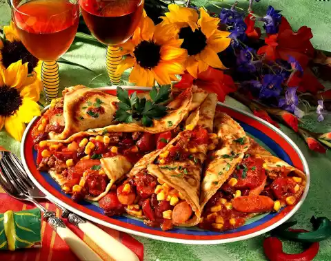 Add corn and beans and warm up briefly. Keep the sausage chili warm. Heat some fat in a smaller pan and add a soup ladle of dough. Bake on both sides until golden brown. Bake 5 more pancakes one after the other, fill with the sausage chili and arrange on a plate. Wash the parsley, dab dry and cut into fine strips, except for a little to garnish. Sprinkle over the pancakes and serve garnished with parsley. Makes 6 filled pancakes