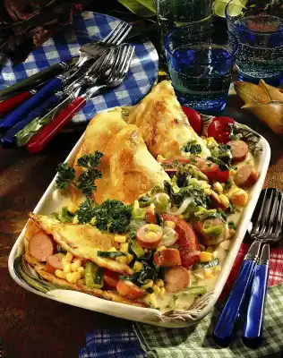 Cut the sausages into slices. Drain the corn. Wash, clean and slice the tomatoes. Add everything to the leek and heat for about 5 minutes. Stir in crème fraiche. Season everything with salt and pepper