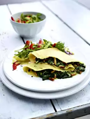 Heat up a pan (24 cm Ø). Heat 2 tablespoons of oil in it in portions. Add 1/4 of the dough and fry over medium heat for 2-3 minutes on each side. Remove and keep warm. Process remaining dough in the same way. In the meantime mix the salad ingredients and vinaigrette. Spread the spinach on the pancakes, sprinkle with pine nuts and fold up. Arrange pancakes and salad on plates