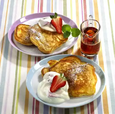 Proceed in the same way with the remaining dough. Results in approx. 21 pancakes. Serve pancakes decorated with curd cheese, icing sugar, mint and strawberries. Maple syrup tastes good with them.