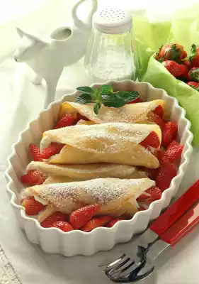 Fold in the strawberries as well. Fry thin pancakes one after the other in hot oil in a coated pan (approx. 12 cm Ø) until golden brown. Stack the finished pancakes on top of each other. Then fill each pancake with some strawberry quark, roll it up and put it in a bowl. Dust with icing sugar and decorate with mint. Makes about 8 pieces