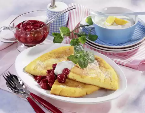 Then let it stand for another 10 minutes. Stir 125 g quark, yoghurt and vanillin sugar until smooth. Remove the pancakes and cut them into 6 pieces. Serve the pancakes, cherry compote and quark together.
