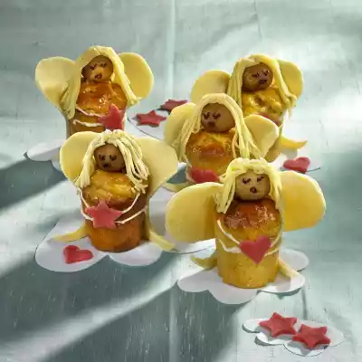In the meantime knead marzipan and 50 g icing sugar. Knead 30 g marzipan with a few drops of food colouring, roll out on a work surface sprinkled with icing sugar and cut out stars and hearts. Roll out the remaining marzipan and cut out 30 wings. Shape the marzipan mixture left over from the cutting into 15 small balls. Take the moulds out of the oven, let them cool for 10 minutes and remove them from the moulds. Heat the jam, pass it through a sieve and spread it on the panettone angels. Knead 2 marzipan potatoes into a potato and place them on the body as a head. Attach wings and press on lightly. Press the 15 marzipan balls individually through a garlic press and attach them as hair on the marzipan potato. Draw eyes and mouth on the face with brown sugar writing. Mix 50 g icing sugar and 1 teaspoon of lemon juice, fill into a freezer bag and cut off a small corner. Spray arms onto the body and attach stars and hearts to the belly