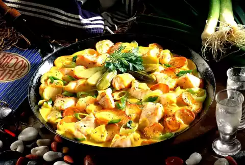 Wash the fish, dab dry and cut into large cubes. Sprinkle with lemon juice. Heat the fat in a pot and sauté the flour in it while stirring. Deglaze with stock and milk, bring to the boil and simmer for five minutes, stirring occasionally.