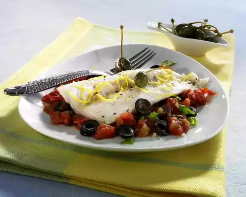 Add both to the sauce and cook for another 5 minutes. Put fish parcels in a pot with little water, cover and cook for about 5 minutes. Take out and open the packet. Season the sauce with salt, pepper and sugar, remove the bay leaf boeatt. Put the sauce on a plate. Arrange the fish on top, garnish with caper apples and the remaining onion green
