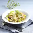 Wash and clean the tomato and cut into small cubes. Wash and clean spring onions. Cut the white part into small cubes, the green part into thin rings. Heat the rest of the oil in a pot, fry the diced spring onions and 3/4 of the rings in it. Add the diced tomatoes, bay leaf and thyme and bring to the boil, simmer for 3 minutes. Slice the olives and drain the capers.
