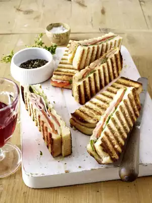 Cover 4 slices with one slice of cooked ham each (if possible not over the edge). Spread parmesan, paprika and rocket on the 4 slices, then cover with a 2nd slice. Roast / grill the sandwiches in the Sandwich Maker for 3-4 minutes.