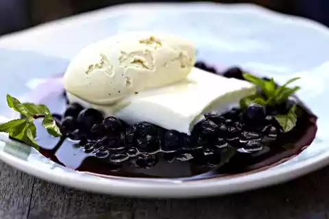 Turn out the panna cotta from the mould and cut into slices. Arrange on the blueberry compote. Serve with vanilla ice cream.