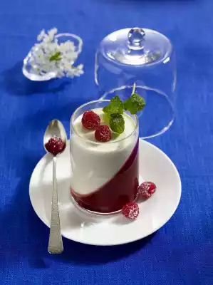 Remove the pod from the cream. Squeeze the gelatine and dissolve in the cream mixture. Let it cool down. Carefully pour the panna cotta onto the raspberry jelly. Chill for about 4 hours. Dust the remaining raspberries and mint with icing sugar and decorate glasses with it. Here you can find more ##recipes by Cornelia Poletto##