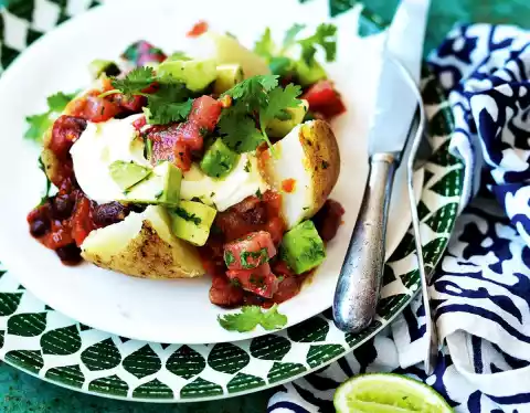 Wrap the potatoes from the aluminium foil, cut them crosswise and break them open a little. Spread bean sauce, tomato and avocado salsa and sour cream on top.