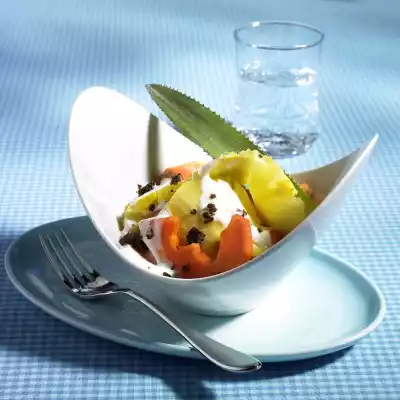 Remove the papaya seeds, peel half of the fruit. Peel the pineapple and remove the hard stalk. Cut papaya and pineapple into thin slices and arrange in a bowl. Spread yoghurt over the fruit and sprinkle bread in crumbs over it.