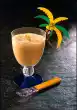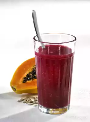 Peel papaya, remove dark seeds. Cut the flesh into pieces. Add raspberries, sunflower seeds and raspberry syrup and puree. Fill up with cherry nectar